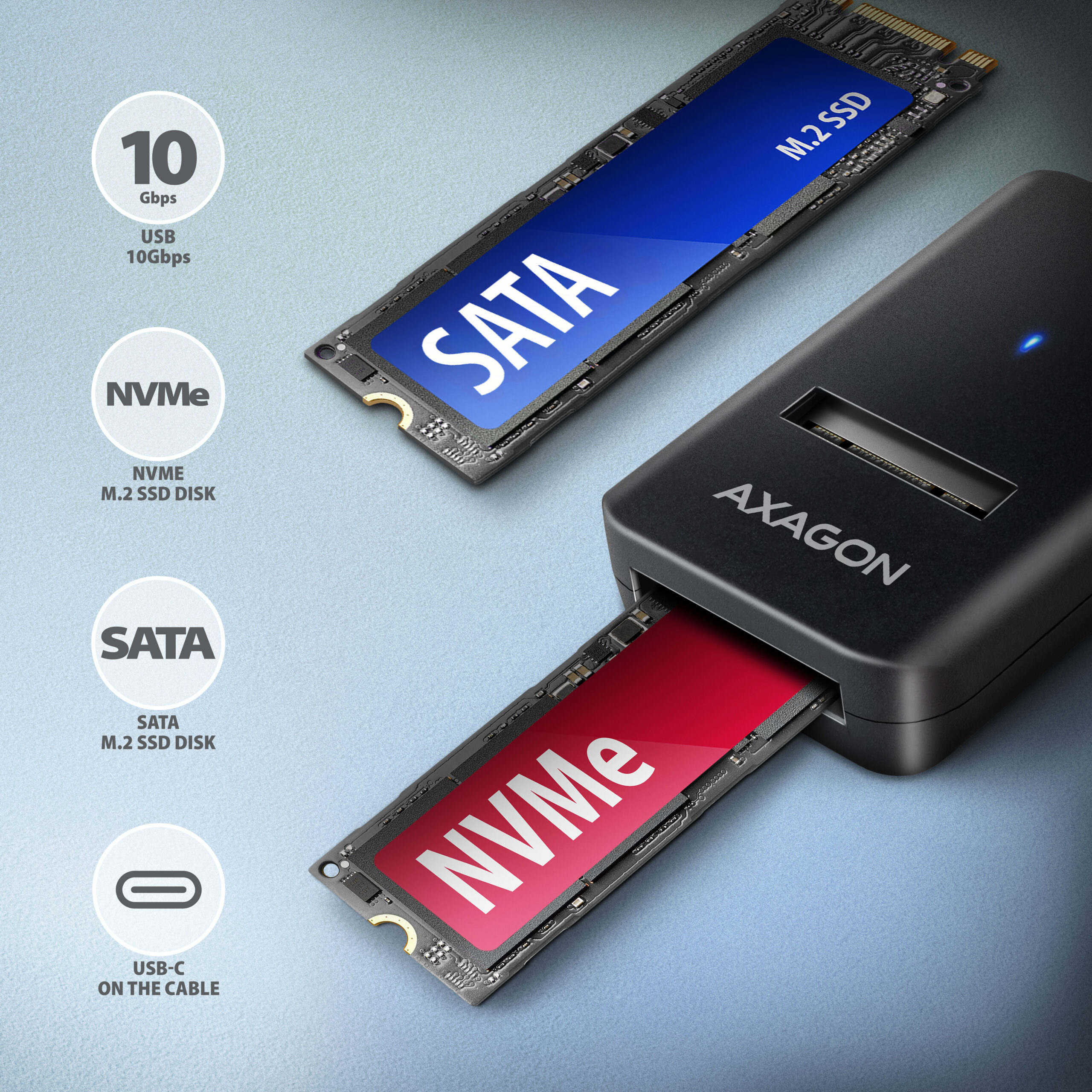• Universele M.2-behuizingen ondersteunen zowel M.2 NVMe als M.2 SATA SSD’s. Ze zijn de ideale keuze voor wie vaak verschillende soorten schijven wisselt, bijvoorbeeld AXAGON EEM2-SB2.